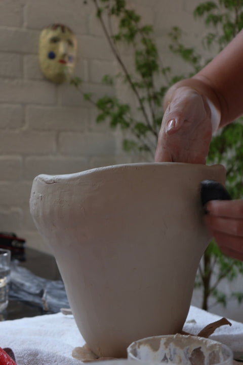 Her practice sits somewhere between the ancient and the imagined. Working primarily with terracotta, she embraces its warmth and imperfections and its grounding connection to earth, hands, and to time. Her forms often lean organic - echoing unearthed relics and drawing on traditions of storytelling, folk art, and personal mythology.